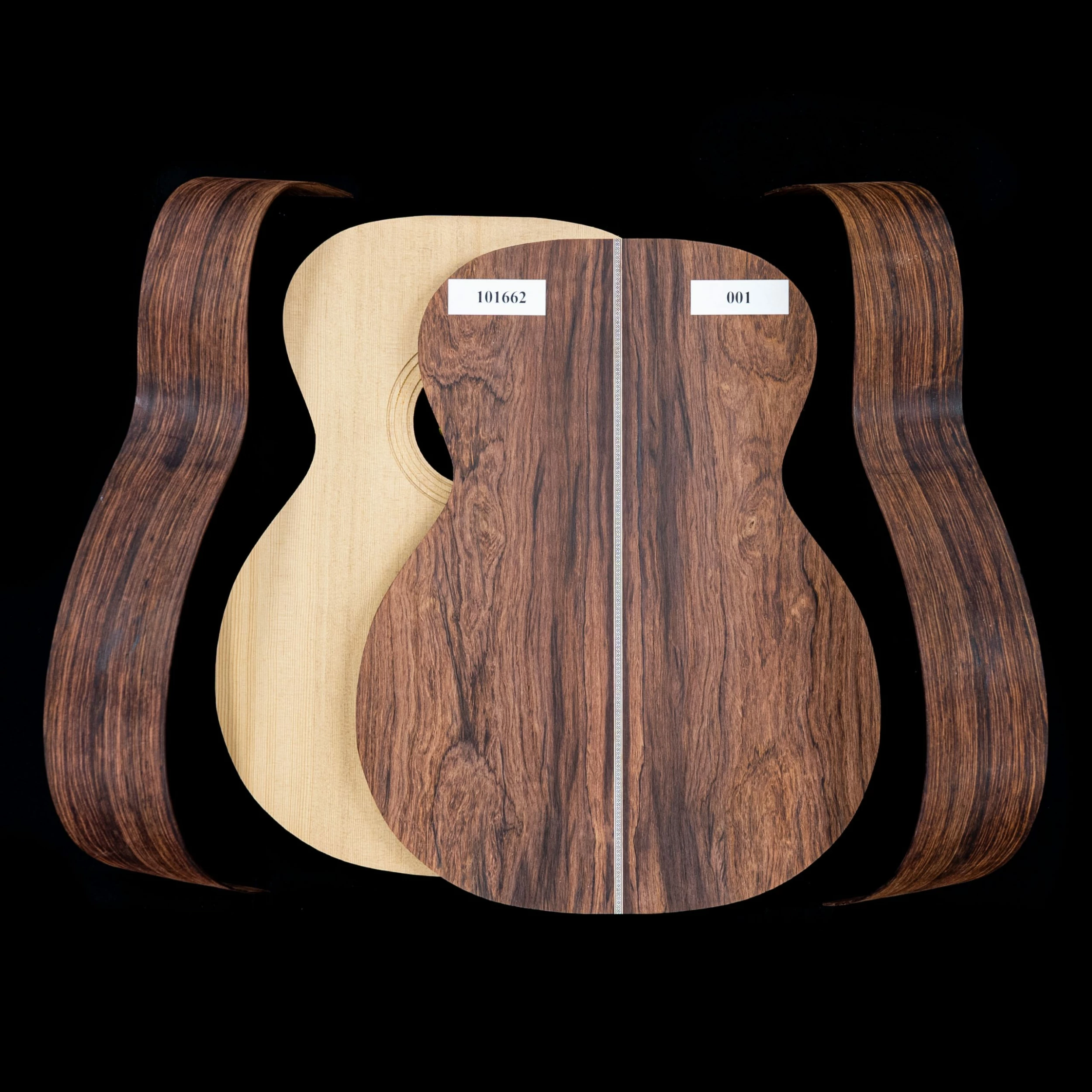 As you know, every piece of wood is unique, and has its own story to tell. When surveying these priceless guitars, we found some with elegant interlocking grain lines, and some that were wild and dynamic. For this reason we’ve photographed each of these kits individually—what you see pictured in the first image is the actual wood you’ll receive.