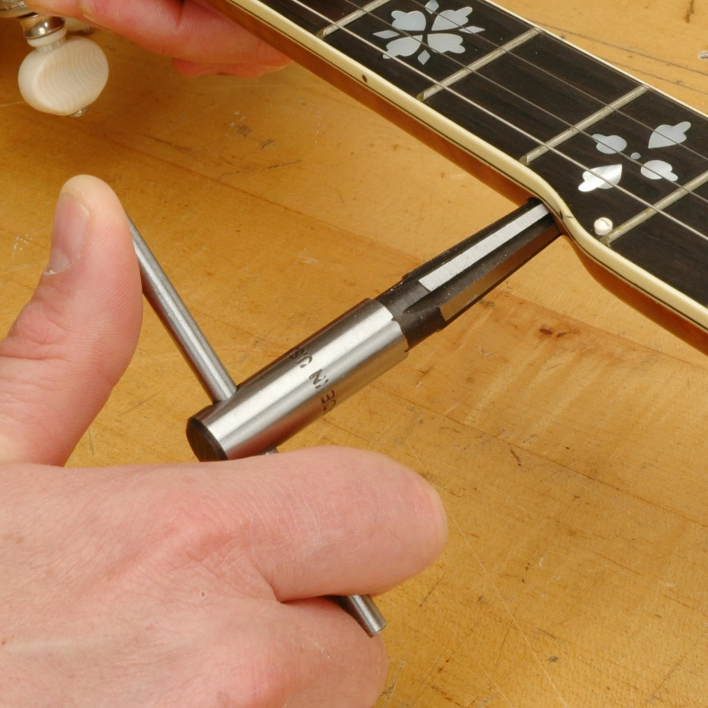 The right tool for correctly tapering a 5th string peghole in a new neck, or for enlarging a standard 5th string peghole to fit a new geared 5th peg.
