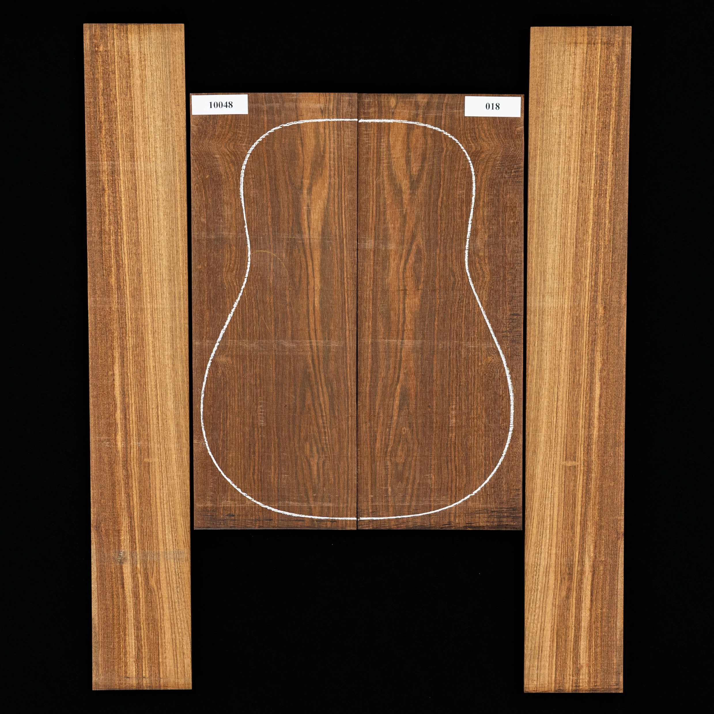 Each bookmatched back and side sets are ready for you to start your build. When joined, they are large enough for a dreadnought. Sides are unprofiled (rectangular) and unbent. Kiln-dried.