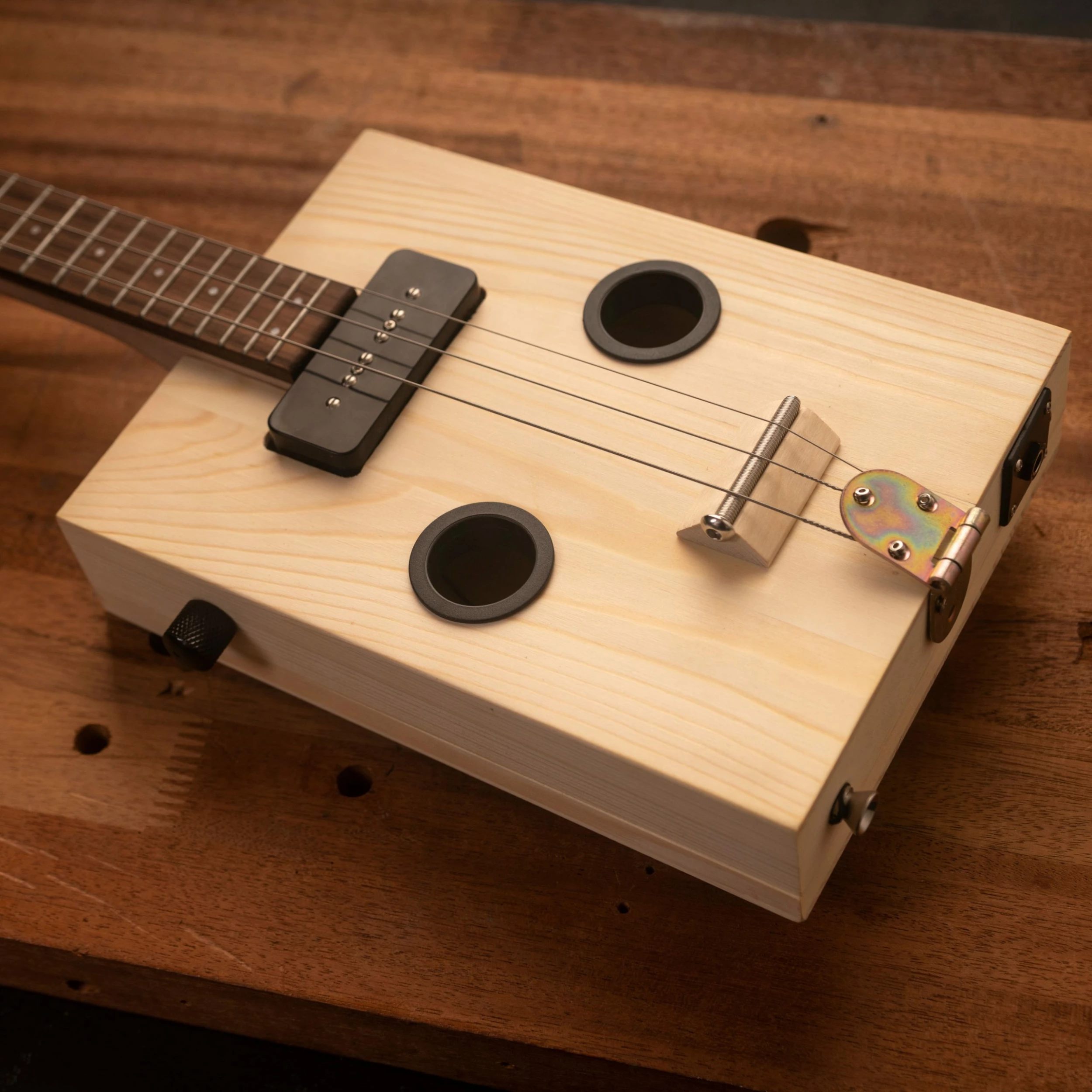 We captured the raw and unpretentious look of a classic cigar box guitar, but totally upgraded the parts, playability, and sound. The box is expertly crafted for you from clear pine, and the mahogany neck is shaped, fretted, and inlaid—with just a minor setup you’re ready to play.
