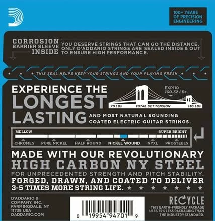 EXP110 delivers all the tone and performance of our best-selling EXL110 set, with 4 times more string life. 10-46 is the most popular gauge for its ideal combination of flexibility and tone.