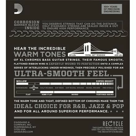 D’Addario’s best-selling Flatwound bass strings, are known for their warm, mellow tone and smooth polished feel. Chromes deliver a deep, rich low bottom end which makes them the flat wound choice of Jazz, R&B and Pop musicians. Fits long scale basses with a string scale length of up to 36-1/4 inches.