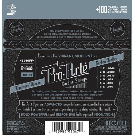 Experience the vibrant, projecting & contemporary tone of D’Addario’s Pro-Arté Carbon strings. Designed to the exacting specifications of our Pro-Arté nylon trebles, our fluorocarbon strings deliver unmatched superior intonation, a responsive attack and modern projecting tone. Paired with the bold and powerful Dynacore basses, Pro-Arté Carbons offer the ideal combination of tension and tone for today’s classical player.
