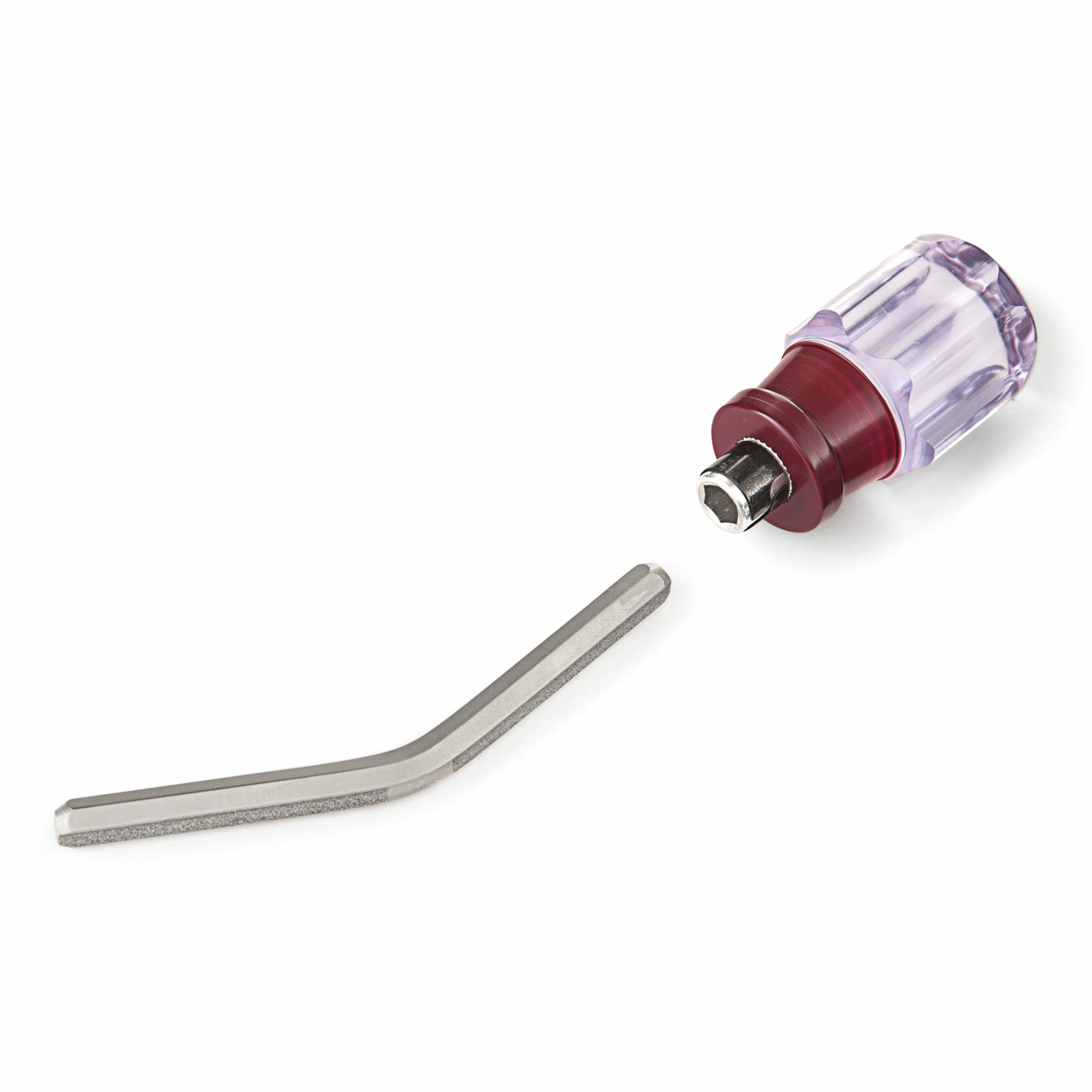 Steel insert with 150 and 300-grit industrial diamond-coated concave cutting surfaces in ONE file for crowning frets. Its angled shape gives extra clearance over the guitar body at higher frets.