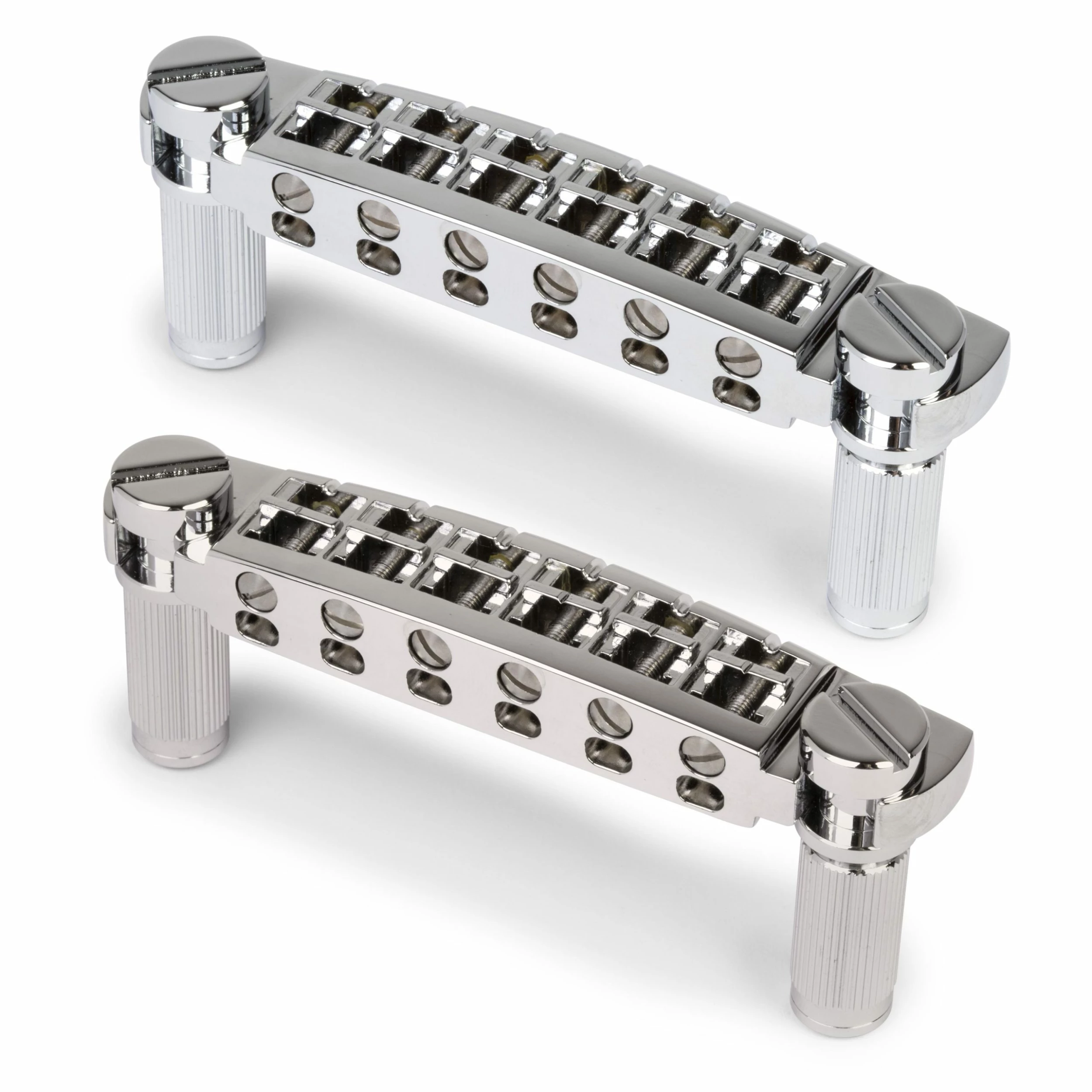 You have the option of notched or unnotched saddles. Cut your own string slots for a custom spacing or play instantly with pre-notched saddles. High quality studs and bushings are included. We took extra care to make sure the bushings fit tight to minimize “lean”. The studs feature M8 x 1.25 threads that fit countless guitars from Epiphone, Schecter, ESP, and more. Also available with standard SAE studs.
