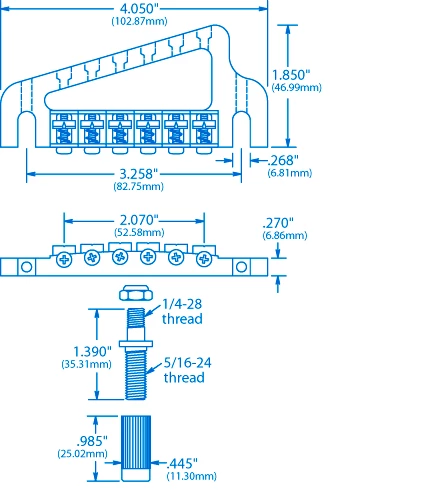 Height-adjustable Super Stud mounting posts feature locking nuts that stabilize the entire unit for more accurate intonation and good tone.
