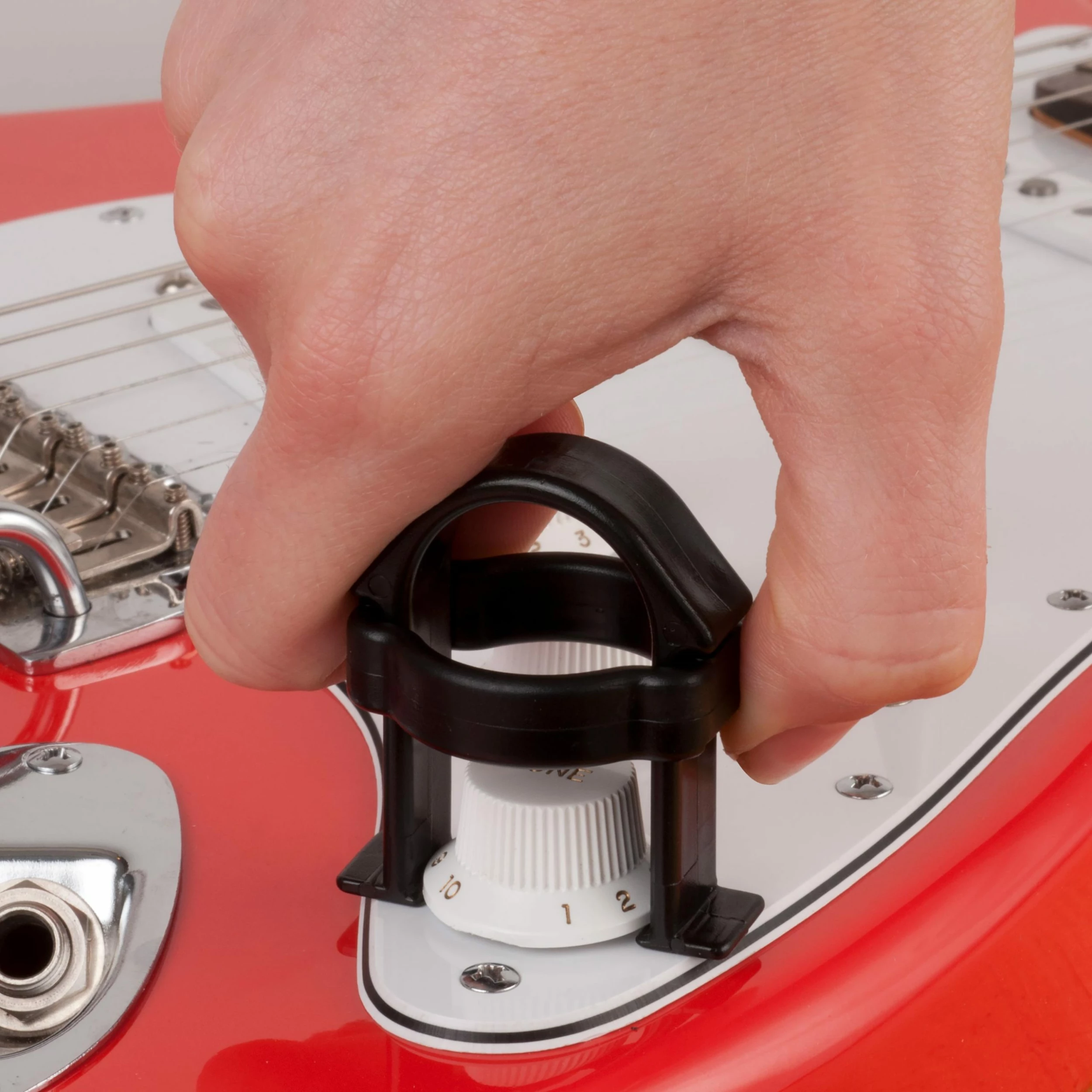 The Pullit Knob Puller is a simple solution for stubborn knobs. Just slide it under the knob, push the tension ring down for a firm grip, and carefully pull the knob off. It works with standard speed knobs, bell knobs, and Strat® knobs. The smooth durable plastic helps protect pickguards and guitar finishes.