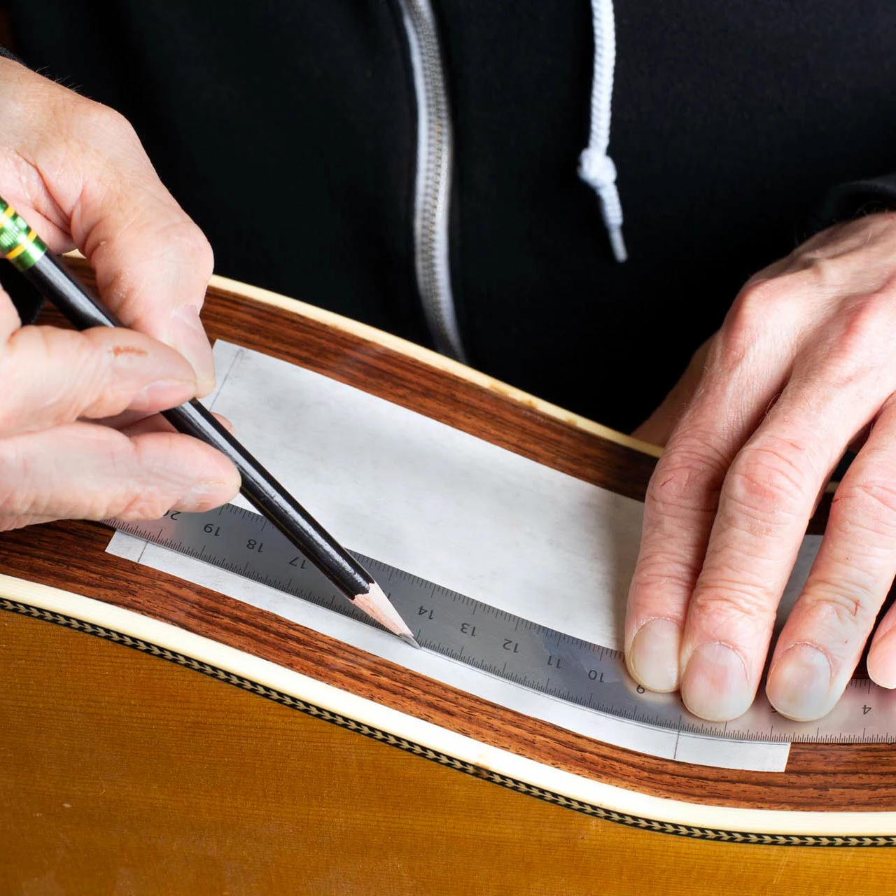 From acoustic sides and cutaways to necks and arched tops, you need a rule that will conform to these shapes to get a truly accurate measurement. Our flexible rules make it easy—they’ve got the same accuracy and features of our Shop Rule, but with thinner and flexible chrome steel construction. The narrow 0.020″ (0.5mm) thickness also fits into most fret slots too.
