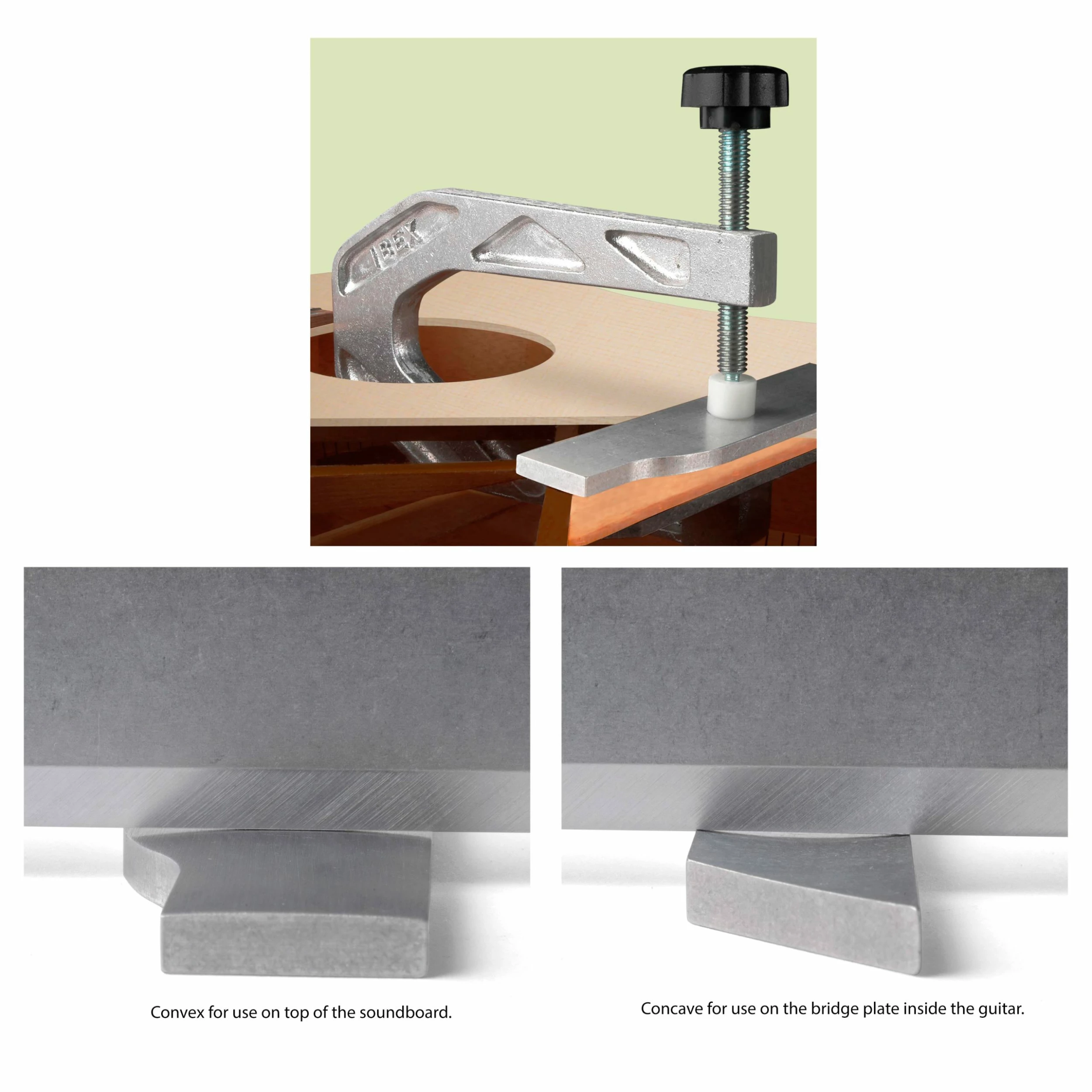 They’re designed for use with the bridge removed from the instrument, and are effective for bridge plates that have been installed with hide glue, aliphatic (yellow) glue, or PVA (white) glue. Simply match the appropriate flatteners to your guitar, heat them to 150 degrees F, dampen the wood on the bridge area and bridge plate, and clamp the flatteners into place for a day or so.