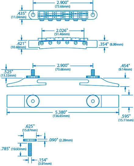 The height is thumbwheel-adjustable from approximately 7/8″ to 1-1/4″ (22.23mm to 31.75mm). Saddles are pre-slotted and adjustable to set accurate string intonation.