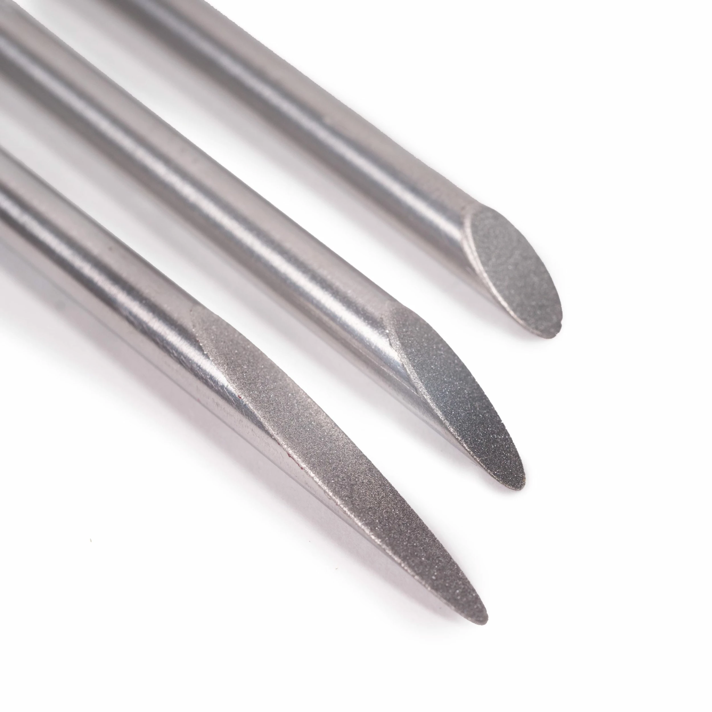 These files are custom designed to work with the strings on, saving you time, and letting you work under playing conditions. They work just like a 3-Corner Fret Dressing File (one of our favorites), and the diamond coating works fast and clean, with no chattering.