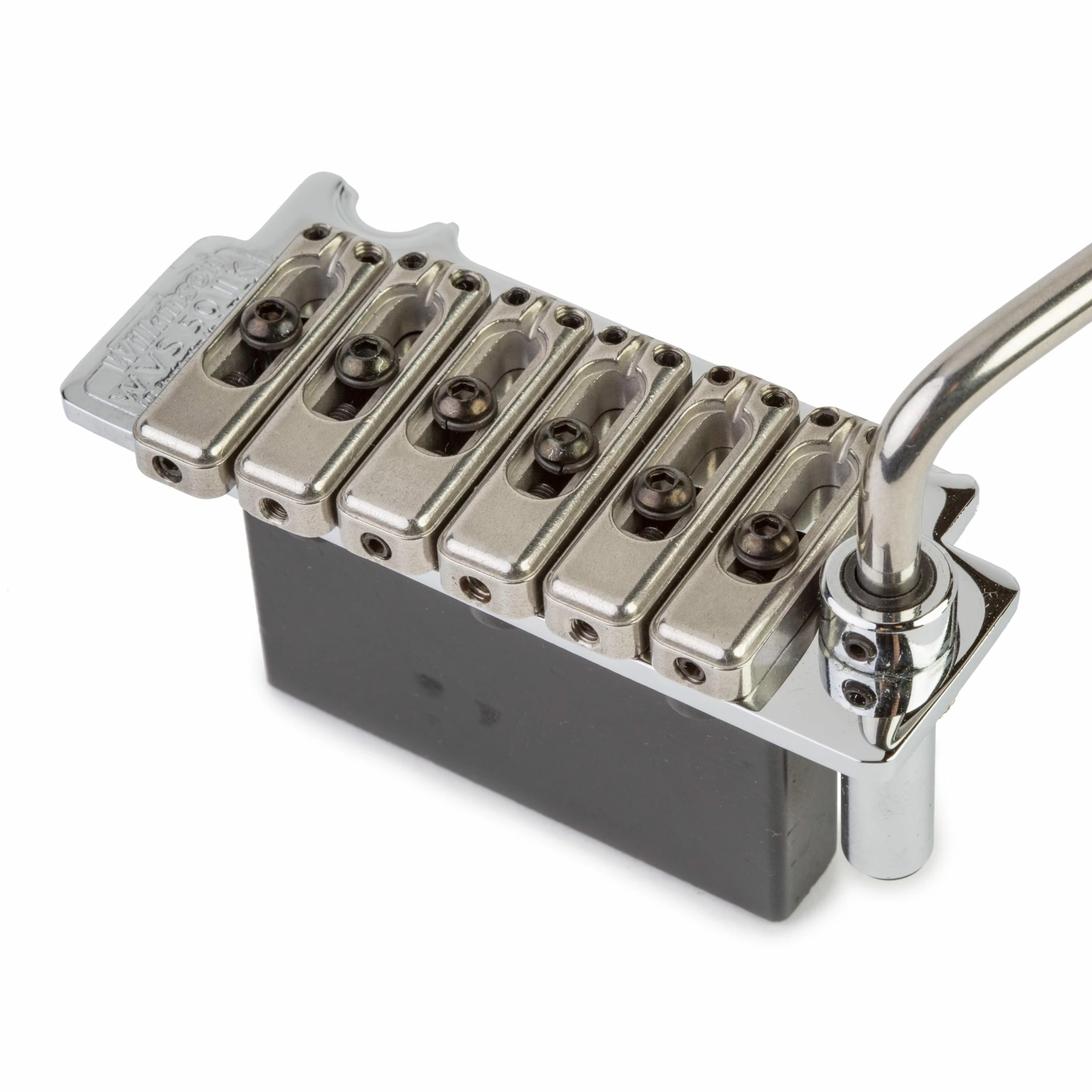 The hardware upgrades are where this kit really shines. The bridge is Wilkinson’s latest version of his amazing WVS tremolo. The knife edges and locking saddles return to pitch with amazing accuracy, and the feel is comfortable under your palm. The steel block also features staggered holes for an incredible feel. The Graph Tech nut keeps the guitar in tune even when you lean into the trem. And you get locking tuners too!